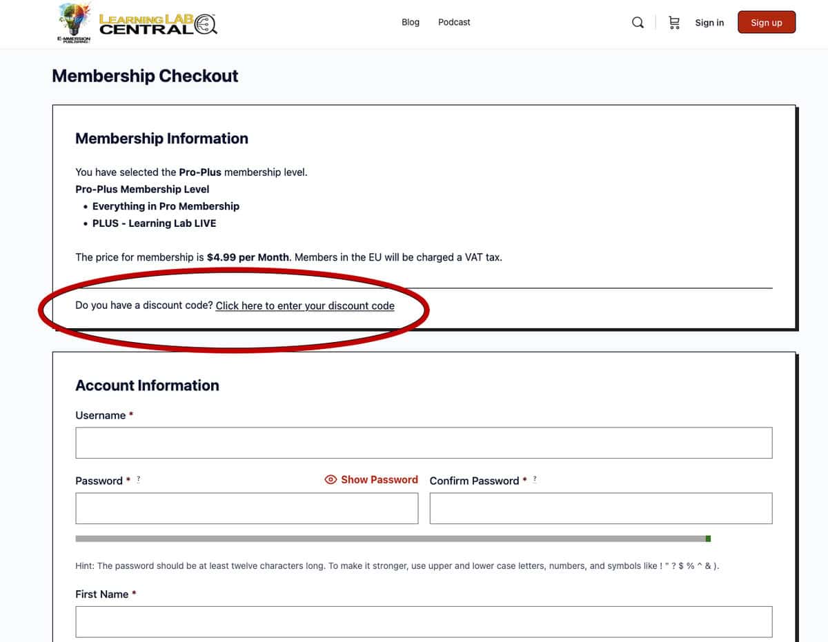 After selecting the membership type (Basic, Pro, or Pro-Plus), you are taken to the Membership Checkout page. In the upper Membership Information section, the last sentence says, “Do you have a discount code? Click here to enter your discount code.”