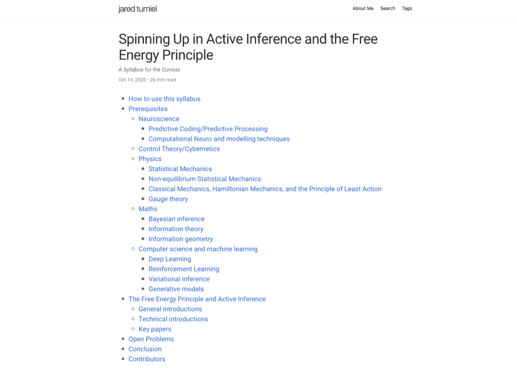 Syllabus: Spinning Up in Active Inference and the Free Energy Principle, by Jared Tumiel